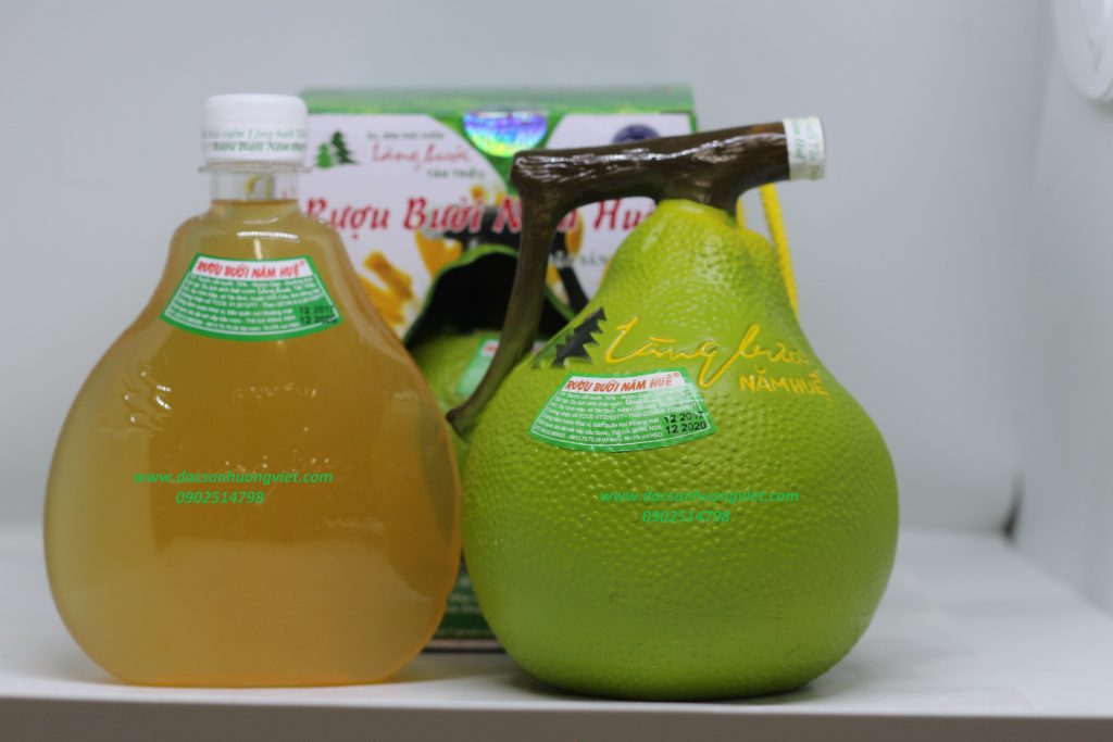 Rượu bưởi được đựng trong bầu gốm hình trái bưởi, là món quà ý nghĩa và đẹp mắt để tặng đối tác, khách hàng.